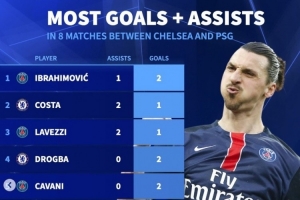 3球:伊布(巴黎,2球1助攻)、迭戈-科斯塔(切尔西,1球2助攻)、拉维奇(巴黎,1球2助攻)
